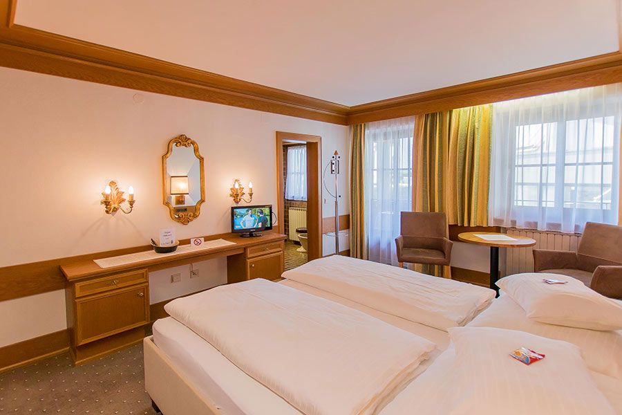 Stilvoll eingerichtete Zimmer mit großzügigen Bädern, die entweder mit Dusche/WC oder Badewanne/WC und teilweise auch mit einem Bidet ausgestattet sind.